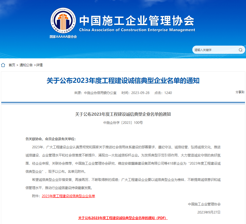 近日,從中國施工企業管理協會官網獲悉,安徽建工三建集團有限公司被認定為“工程建設誠信典型企業”。