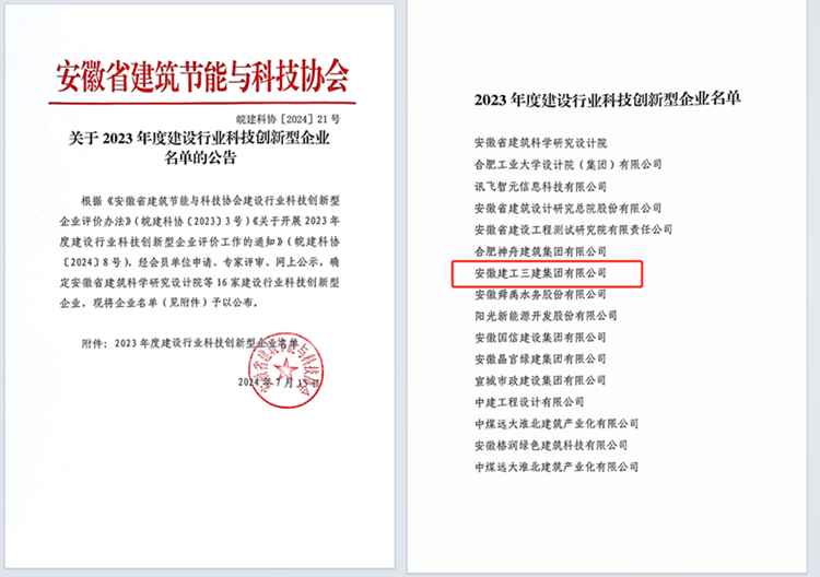 近日,安徽省建筑節(jié)能與科技協(xié)會(huì)公布“2023年度建設(shè)行業(yè)科技創(chuàng)新型企業(yè)”名單,安徽建工三建集團(tuán)作為唯一一家省屬國(guó)有施工企業(yè)榮登榜單。